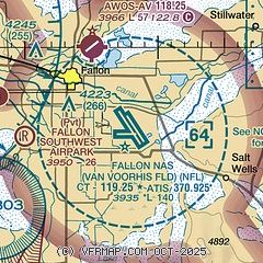 | E60-25 | HOOK E28(B) (1290 FT). |  | E60-07 | HOOK E28(B) (1300 FT). |  | E60-13L | HOOK E28(B) (952 FT). |  | E60-31R | HOOK E28(B) (951 FT). |  | E60-31L | HOOK E28(B) (1893 FT). |  | E60-13R | HOOK E28(B) (1804 FT). |  | - | A-GEAR:  E-28(B) APCH END ON PARALLEL RWYS NML DERIGGED. |  | - | TFC PAT: ACTVT LDG/TAXI LGT ON APCH. RDC RWY SEPN STD IN EFCT FOR USN/USMCFT. |  | - | MISC: BASE OPS D890-2419/2458/C775-426-2419/2458. |  | - | MISC: PPR TO SKED FRTC AIRSPACE AFT AIRFIELD HRS - NAS FALLON OPS OFFICER APVL EXTD AIRFIELD HRS. |  | - | FUEL - HOT RFL 4 HR PPR - D890-2508/9/C775-426-2508/9; A++ |  | - | CTN: 126 FT RADAR DOME 1.1 NM SW OF ATCT. TWY C, S APN TO RWY 25 APCH END VRBL WID TAPERING TO 50 FT E OF RWY 13R-31L. |  | - | NOISE ABATEMENT: DEP RWY 31L/R VFR TURN RIGHT HDG 040 OVER DEP END. DESELECT AFTERBURNER AT EOR & CLB AS QUICKLY AS PSBL. |  | - | CTN: HVY MIL TRNG OPS ALL HRS. |  | - | MISC: RWY 13L/31R TGL OVR 100000 LB NA. |  | - | MISC: CLASS D AIRSPACE REVERTS TO CLASS E WHEN TWR CLSD; WHEN TWR OPEN, CLASS E AIRSPACE REVERTS TO CLASS D. |  | - | JASU:  1(GTC-85) 1(NCPP-105) 2(NC-8A). |  | - | RSTD: ALL CIV ACFT MUST HAVE CURRENT CALP AND MEET ALL RQRMTS. CALP POC IS NASF ODO LCTD IN BLDG 301 AT C775-426-2419. |  | - | FLUID:  SP LOX. |  | - | TRAN ALERT: NO TSNT MAINT/HGR SPACE OR DE-ICE AVBL. |  | - | SEE FLIP AP/1 SUPPLEMENTARY ARPT RMK. |  | - | RSTD: PPR 24 HR IN ADVN FOR TSNT SVC EXC MEDEVAC, SAR, DEPLOYED SQDN/CVW OR SKED L FLT. PPR VALID 4 HR BYD ETA UNLESS RESKED - D890-3415/3479/C775-426-3415/3479. |  | - | CTN: BIRD ACT WI 15 NM SFC - 3000 FT. GA OPS FM FALLON MUNI 5 NM NNW. |  Instrument ProceduresNOTE: All procedures below are presented as PDF files. If you need a reader for these files, you should download the free Adobe Reader.NOT FOR NAVIGATION. Please procure official charts for flight.FAA instrument procedures published for use from 30 October 2025 at 0901Z to 27 November 2025 at 0900Z.